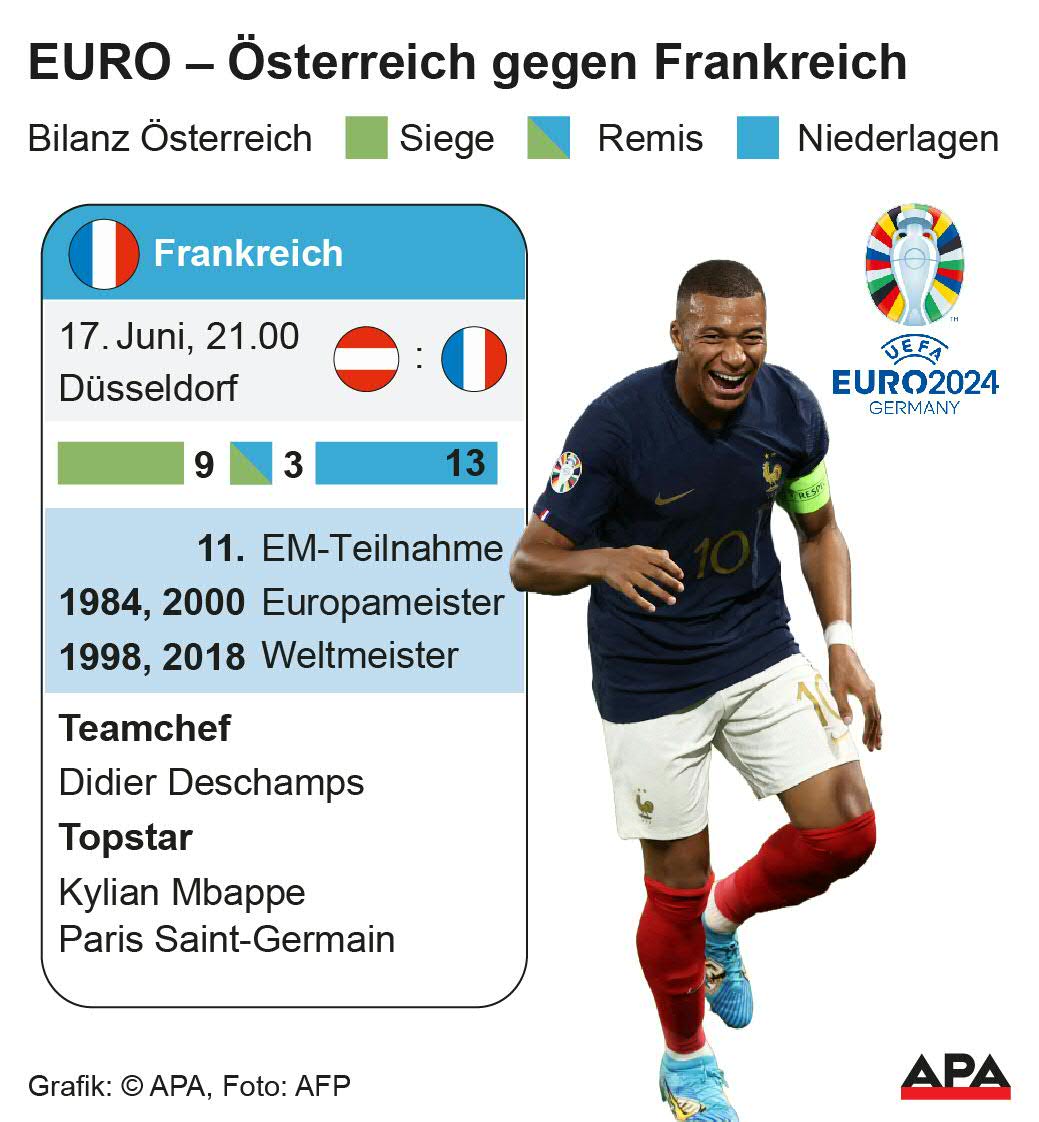 Das ÖFB-Team trifft in seinem Auftaktspiel der Europameisterschaft am Montag (21.00 Uhr/live auf ServusTV und ARD) in Düsseldorf auf Frankreich, das vom künftigen Real-Star Kylian Mbappe angeführt wird.