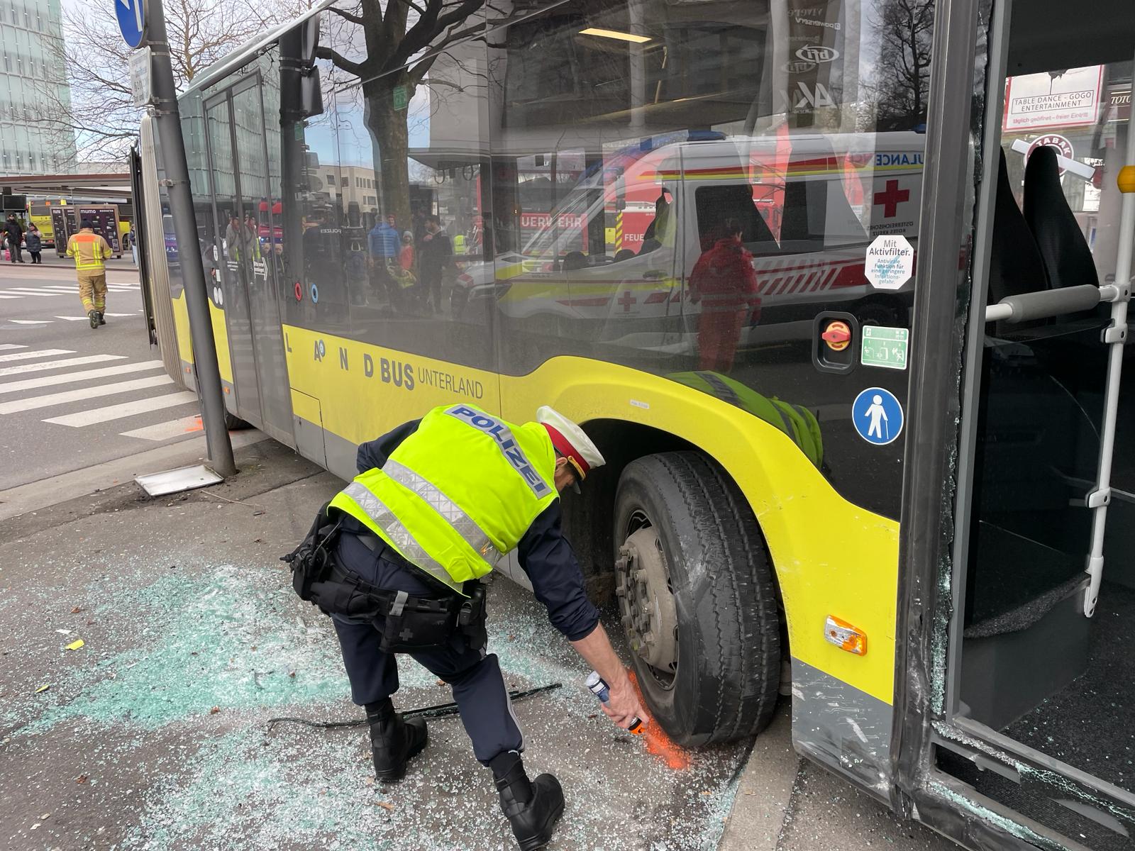 Die Fahrerin lenkte daraufhin nach links, verlor aus bislang unklarer Ursache die Kontrolle über den Gelenkbus und kollidierte gegen einen in Kreuzungsnähe geparkten, unbesetzten Pkw. Dieser wurde durch den Aufprall gegen einen am Gehsteig befindlichen Fußgänger geschoben. Der Gelenkbus fuhr in weiterer Folge gegen die Betonsäule eines dortigen Cafés wodurch er zum Stillstand kam.