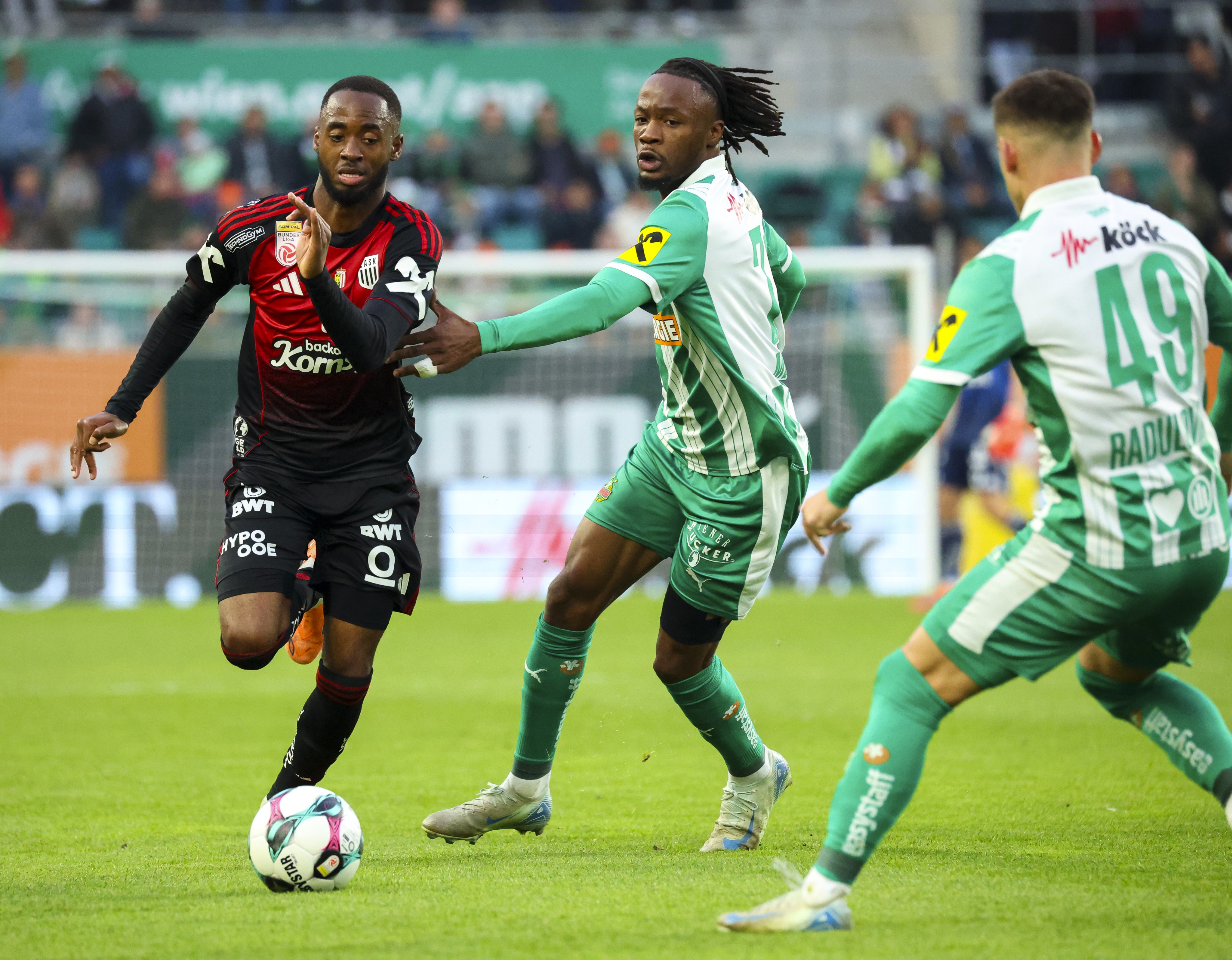 Eine erste Torannäherung der Wiener gab es durch Mbuyi, dessen Schuss aber zu schwach ausfiel und am Tor vorbeirollte (17.). Im Gegenzug traf George Bello nach Vorlage des quirligen Horvaths nur die Stange, Hedl wäre ohne Chance gewesen (18.). Adeniran scheiterte vor der Pause zunächst an Hedl (37.), machte es aber fünf Minuten später besser. Nach einem Ballverlust der Gastgeber fand Kasper Jörgensen mit einem langen Pass den US-Stürmer, der abgezockt erhöhte.