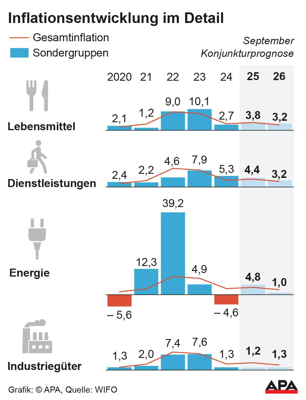 Diese Preissteigerungen bleiben laut Wifo als Basiseffekte im Jahr 2025 in der Inflationsberechnung erhalten. Von Dezember 2025 auf Jänner 2026 rechnen die Wirtschaftsforscher folglich mit einem Rückgang des Inflationsbeitrages, insbesondere aus dem Bereich Strom, um rund 0,75 bis 1 Prozentpunkt.