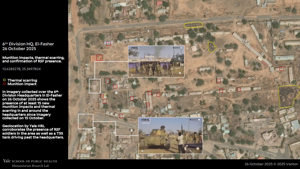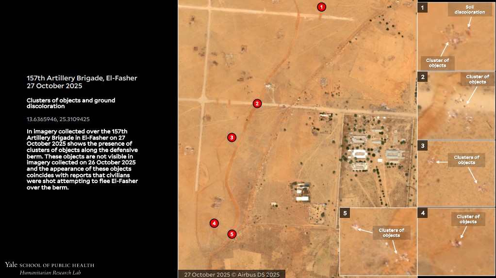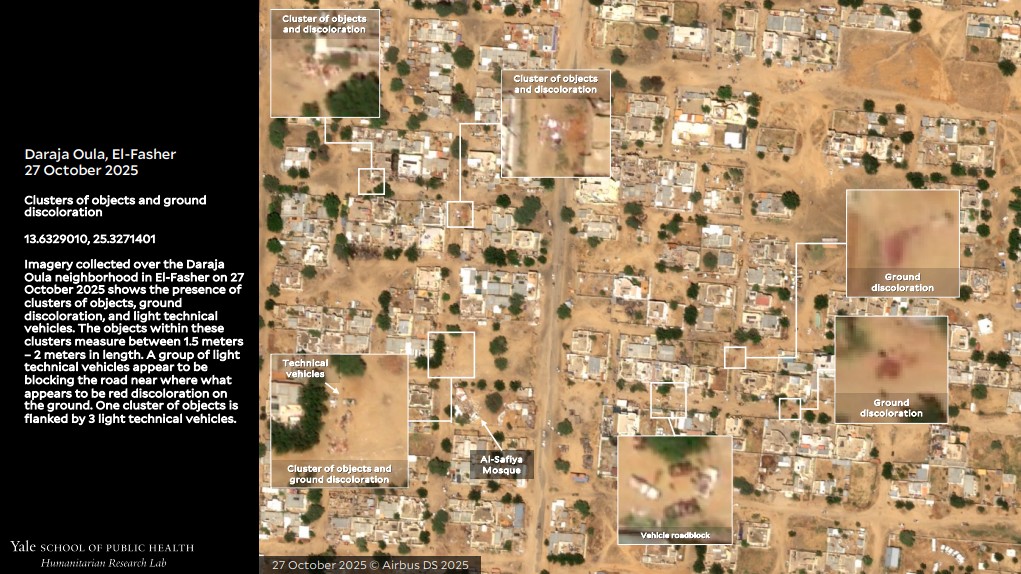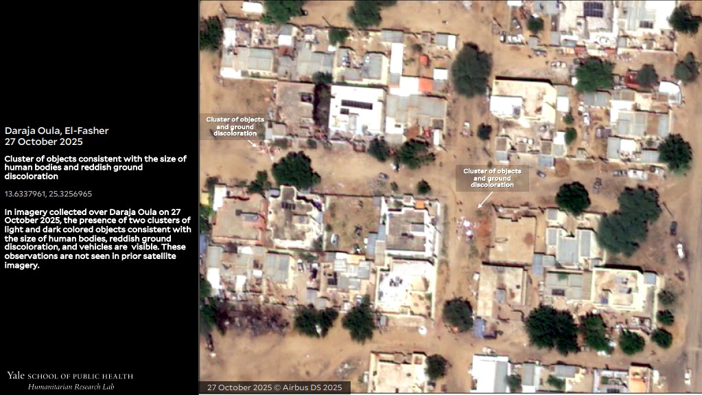 In der sudanesischen Stadt Al-Faschir mehren sich die Hinweise auf ein Massaker an der Zivilbevölkerung. Satellitenbilder, veröffentlicht von der US-Universität Yale, zeigen möglicherweise Leichenansammlungen in Wohngebieten, auf Universitätsgeländen und an früheren Militärstandorten. Zeitgleich berichten Geflüchtete von gezielten Tötungen und ethnisch motivierter Gewalt durch die paramilitärische Gruppe Rapid Support Forces (RSF), die die Stadt am 26. Oktober nach monatelanger Belagerung eingenommen hatte.