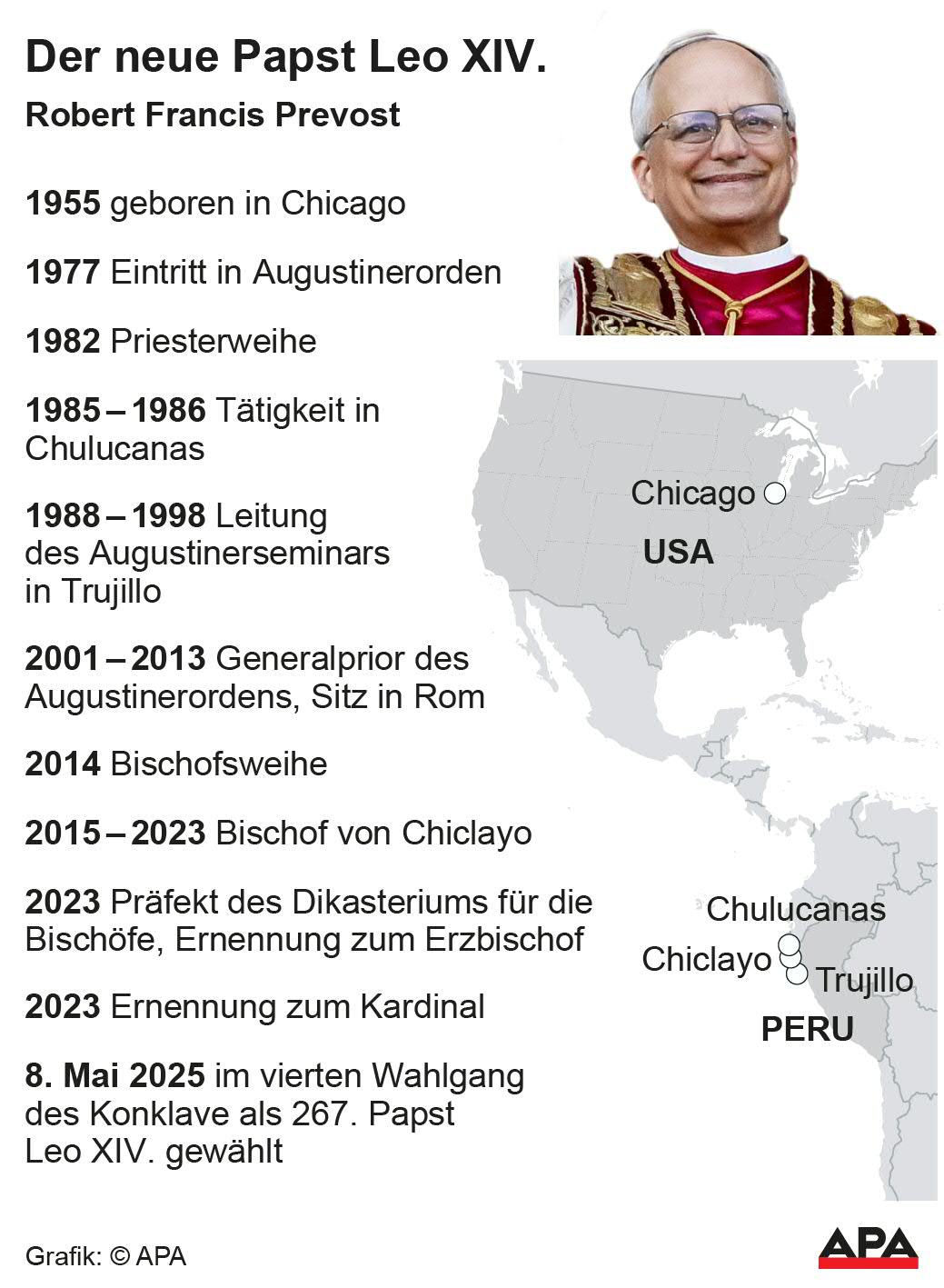 Der neue Papst Leo XIV. aus den USA ist als Ordensmann in Rom, in der vatikanischen Kurie und der Weltkirche zuhause. Kathpress nennt wichtige Stationen seines Lebens vor der Wahl.