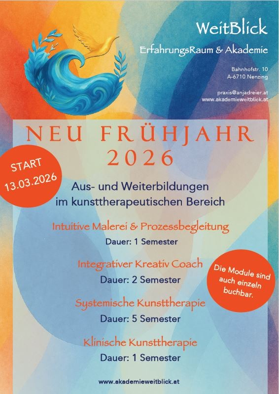 Am 13. März 2026 beginnt zudem ein ganz neuer Ausbildungsbereich: die Kunsttherapie – ein Weg, auf dem Farben, Formen und Gefühle miteinander sprechen dürfen und Heilung auf leise, kreative Weise geschieht.