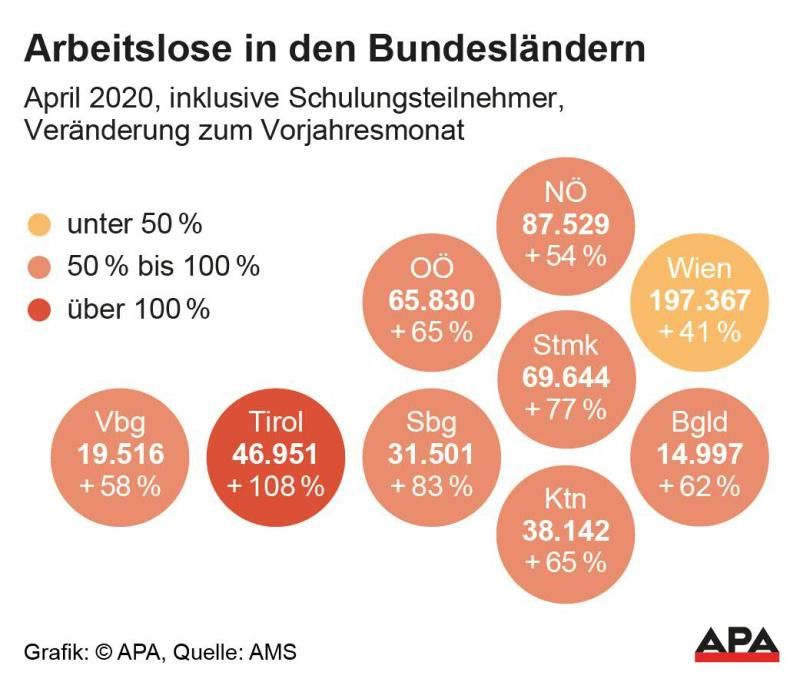 Die Coronakrise trifft die Arbeitsmärkte in den Bundesländern deutlich unterschiedlich: Während sich die Anzahl der Arbeitslosen und Schulungsteilnehmer Ende April im Vergleich zum Vorjahresmonat in Tirol auf knapp 47.000 mehr als verdoppelte (+108 Prozent), stiegen die Zahlen in Wien um 41 Prozent auf über 197.000.