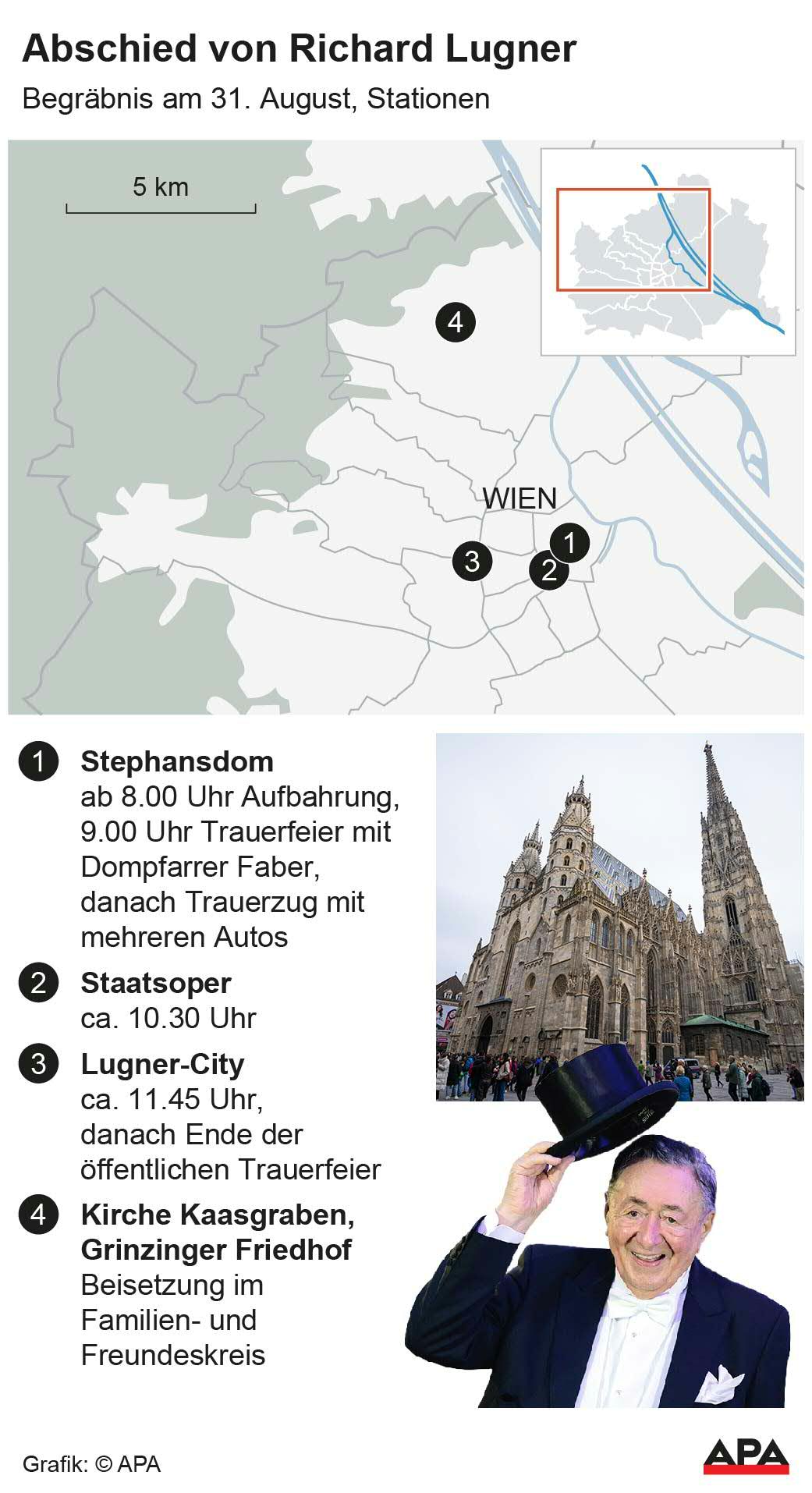 Am 31. August findet das Begräbnis von Richard Lugner statt. Bei einer Gedenkstunde im Wiener Stephansdom, wo Lugner aufgebahrt wird, hat auch die Öffentlichkeit die Möglichkeit, dem Baumeister "Lebewohl" zu sagen. Der Dritte Nationalratspräsident Norbert Hofer (FPÖ), der mit Lugner freundschaftlich verbunden war, wird im Zuge der Trauerfeier eine der Trauerreden halten. Die Feier selbst wird auch Bezug auf die größte Leidenschaft des Baumeisters nehmen: den Wiener Opernball.