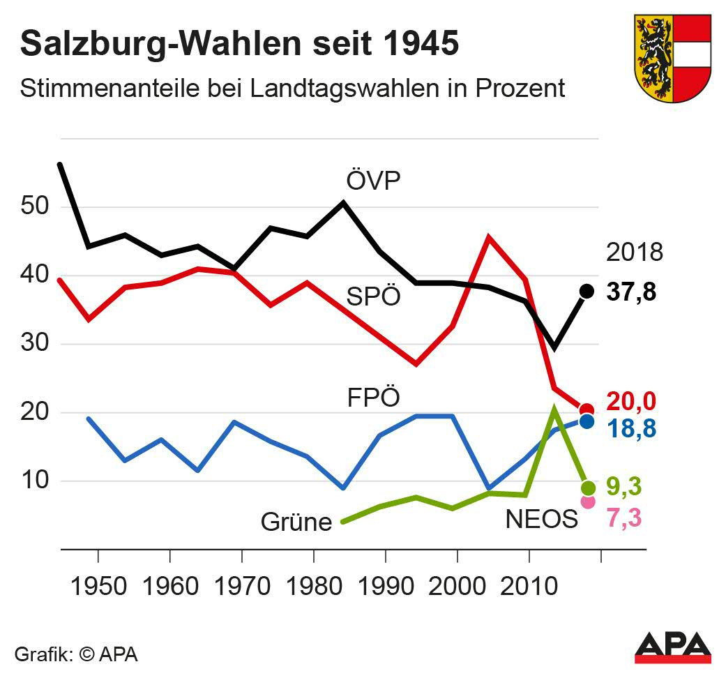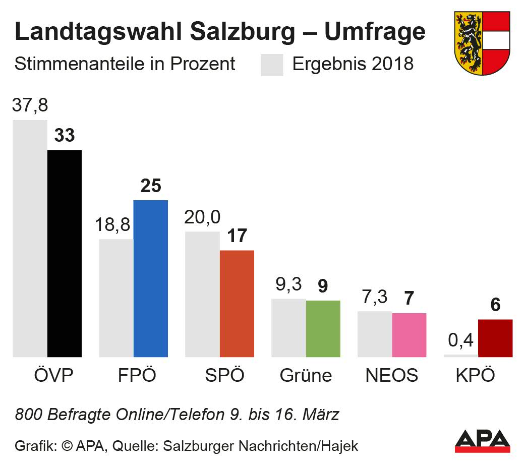 Ein Rennen um Platz zwei liefern sich am Sonntag SPÖ (2018: 20,0 Prozent) und FPÖ (2018: 18,8 Prozent). Chancen auf das Überspringen der Fünf-Prozent-Hürde und damit den Einzug in den Landtag darf sich diesmal auch die KPÖ Plus ausrechnen. Recht aussichtslos dürfte dieses Unterfangen allerdings für die auf Protestwählerstimmen hoffenden Listen "Menschen Freiheit Grundrechte" (MFG) und "Wir sind Salzburg" (WIRS) sein.