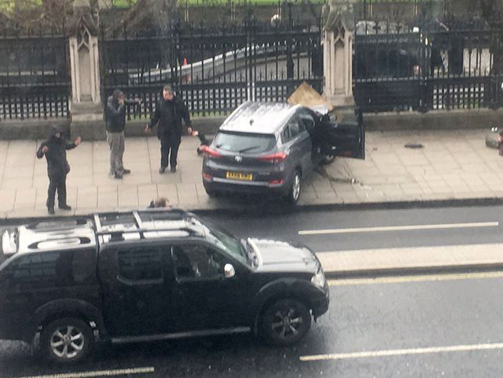 ©People stand near a crashed car and an injured person lying on the ground, right, on Bridge Street near the Houses of Parliament in London, Wednesday, March 22, 2017. Britain has been targeted Wednesday by what authorities are calling a terrorist incident, after vehicle mowed down pedestrians on London's Westminster Bridge, killing at least one woman and leaving others injured, around the same time as a knife-wielding attacker stabbed a police officer and was shot on the grounds outside Britain's Parliament. (James West via AP) Mandatory credit