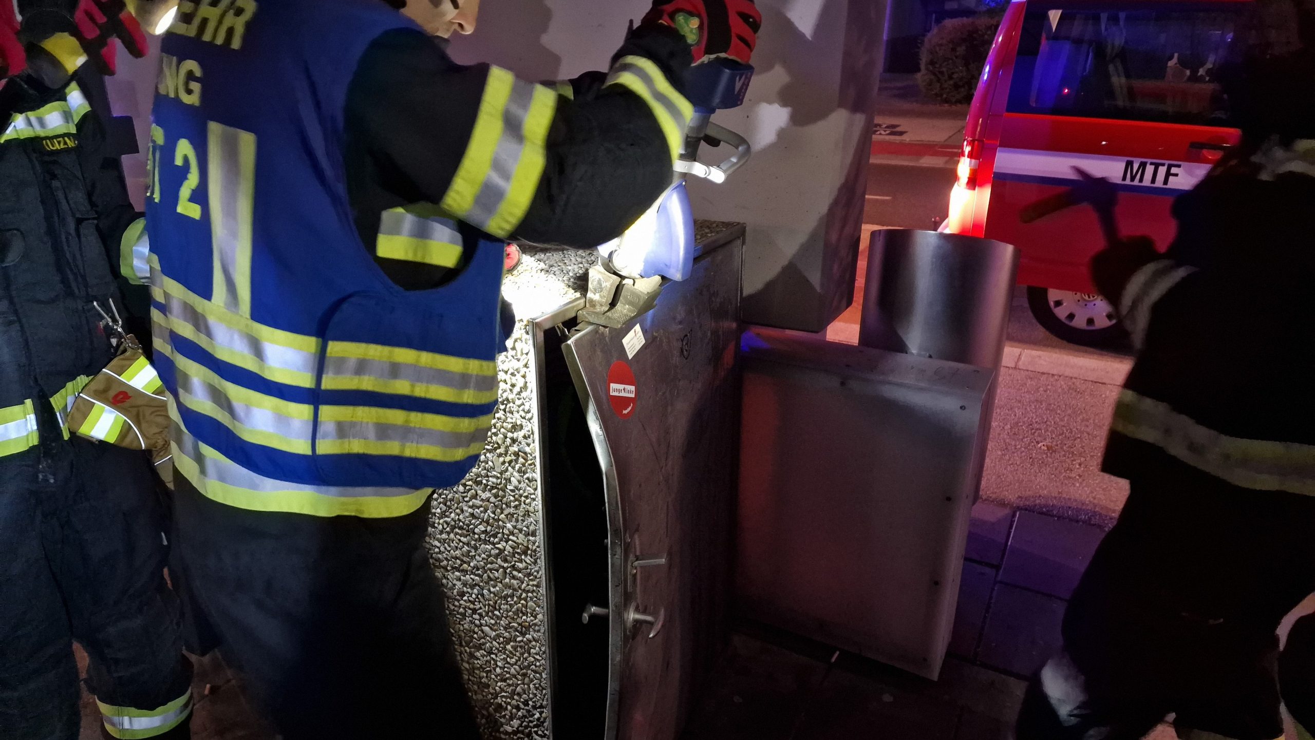 Aus diesem Grund wurde gegen 04:10 ein Notruf an die Feuerwehr abgesetzt. Die rasch eingetroffene Feuerwehr Mödling stellte vorerst Sprechkontakt zur Person her. Anschließend konnte die Paketbox mit dem akkubetriebenen Türöffnungsgerät und einem Halligentool gewaltsam geöffnet werden.