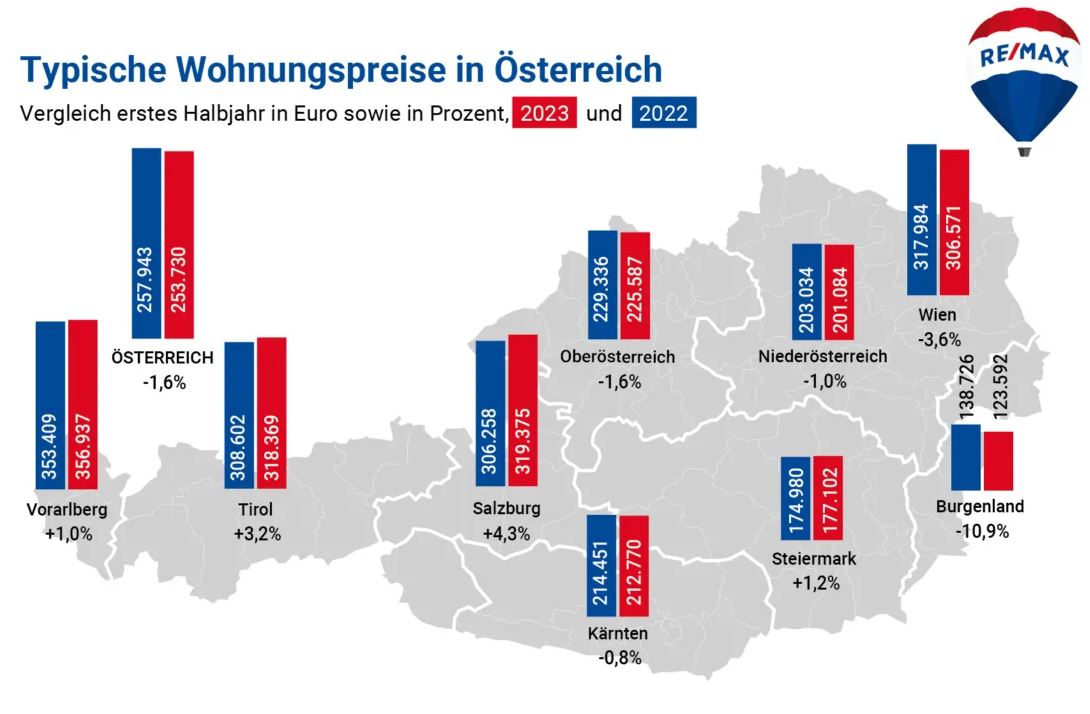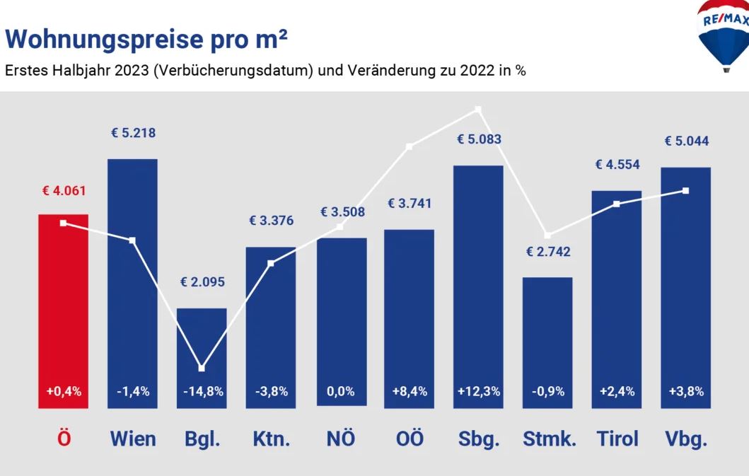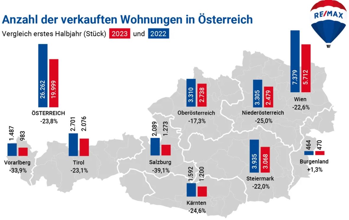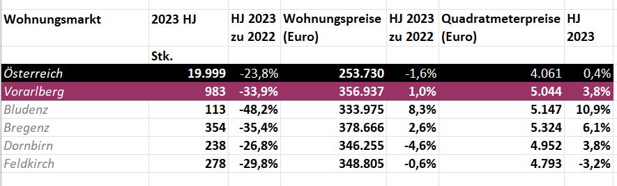 Im ersten Halbjahr 2023 verzeichnete Vorarlberg einen spürbaren Rückgang bei den Verkaufsmengen. Mit 983 verkauften Wohnungen sank die Zahl um 33,9 Prozent im Vergleich zum Vorjahr. Das ist prozentuell das zweitstärkste Minus nach Salzburg. Dies ist das erste Mal seit 2014, dass die Verkaufszahlen unter die Tausendermarke gefallen sind.