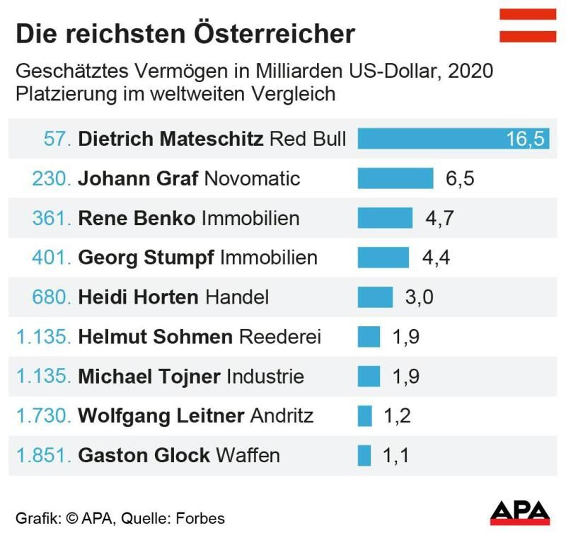 Mit einem Nettovermögen von 6,5 Mrd. Dollar deutlich hinter Mateschitz belegt Novomatic-Eigentümer Johann Graf (73) als zweitreichster Österreicher international Platz 230. Gegenüber dem Vorjahr schmolz sein Vermögen der Erhebung zufolge um 1,6 Mrd. Dollar, wodurch er von Platz 181 um 49 Ränge nach unten rutschte.