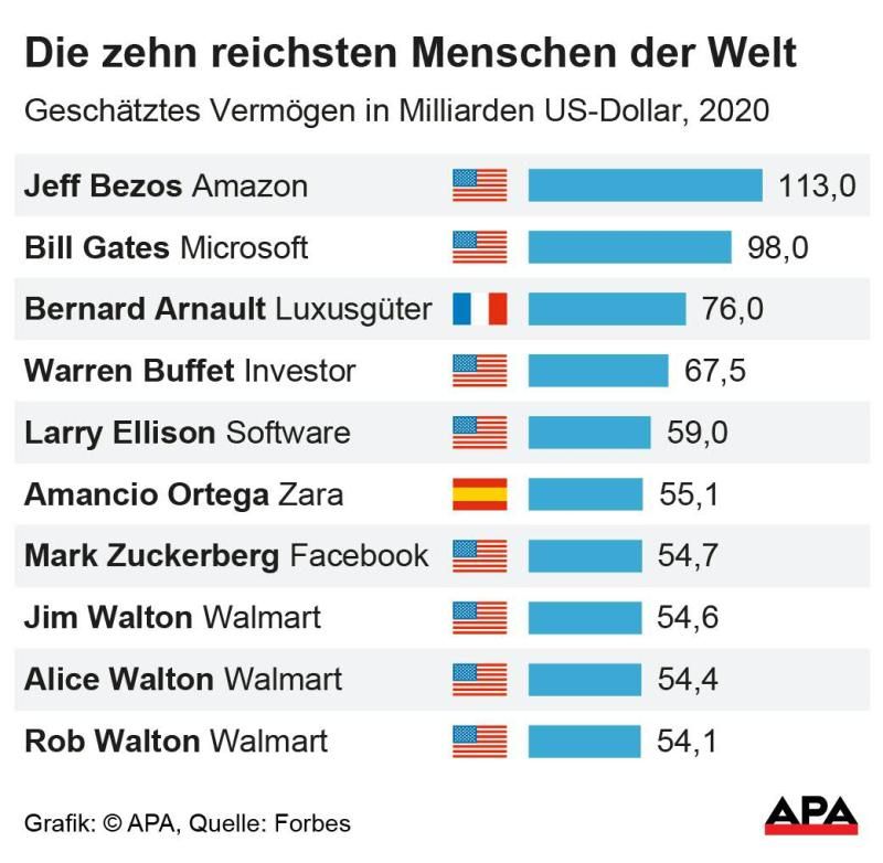 An zweiter Stelle folgt Microsoft-Gründer Bill Gates (64) mit 98 Mrd. Dollar, vor dem Chef des französischen Luxusgüter-Konzerns LVMH, Bernard Arnault, und Familie mit 76 Mrd. Dollar.