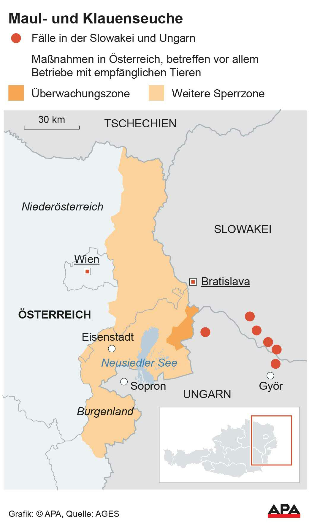 Die Maßnahme betreffe in erster Linie Übergänge "überall da, wo Kontrollen nicht möglich sind", wurde der Sprecher vom Nachrichtenportal zitiert. "Die großen Grenzübergänge bleiben offen", hieß es zur APA. Zuletzt war es in der benachbarten Slowakei zu einem Ausbruch gekommen. Hinweise auf eine Einschleppung nach Österreich gebe es derzeit noch nicht.