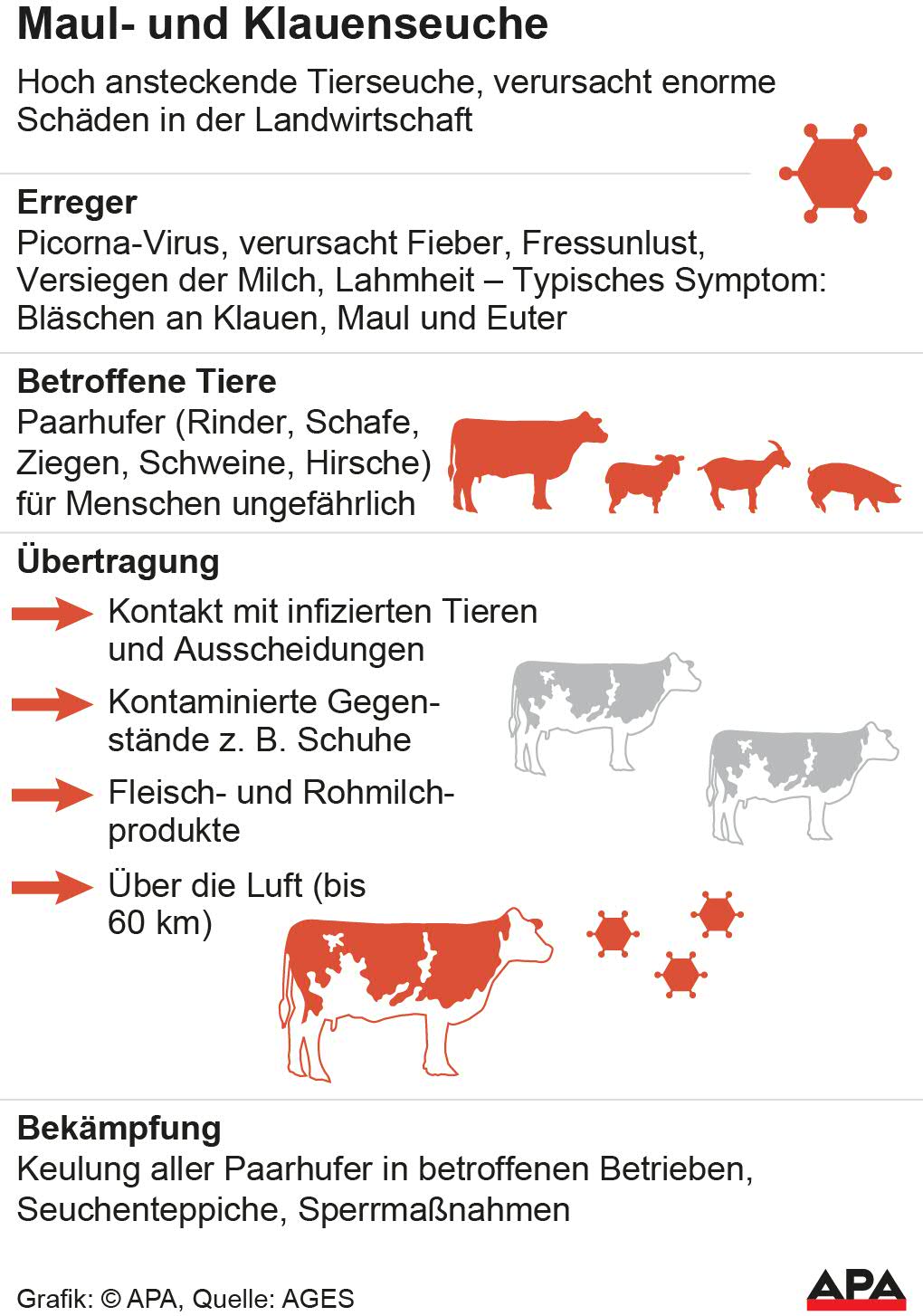 Auch Johannes Schmuckenschlager, Präsident der Landwirtschaftskammer Niederösterreich, hatte eine vorübergehende Schließung kleiner Übergänge gefordert. Weiters verlangte der ÖVP-Nationalratsabgeordnete per Aussendung unter anderem eine strikte Kontrolle des Einfuhrverbots für lebende Nutztiere sowie Fleisch- und Milchprodukte und einen umfassenden Krisenplan, "um im Ernstfall rasch und gezielt reagieren zu können". Gemeinsam mit ÖVP-Landesvize Stephan Pernkopf appellierte Schmuckenschlager auch, in den kommenden Wochen auf nicht unbedingt notwendige Reisen in betroffene Gebiete zu verzichten.