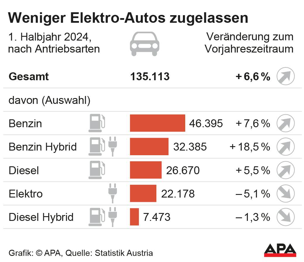 Die Neuzulassungen von Elektroautos sind jedoch um 5,1 Prozent auf 22.178 gesunken, während konventionelle Fahrzeuge mit 73.065 Neuzulassungen ein Wachstum von 6,8 Prozent verzeichneten, wie Statistik Austria mitteilte.