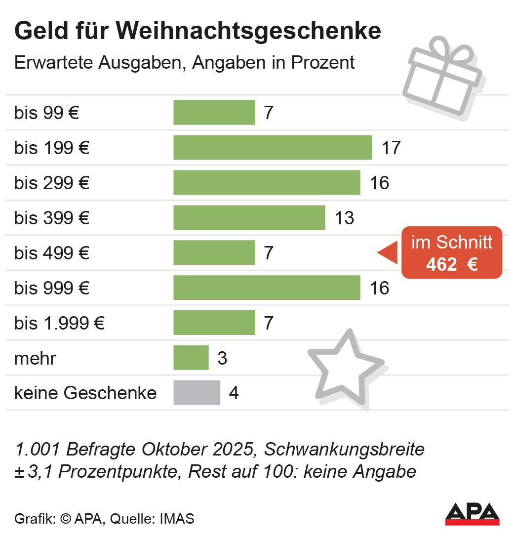 54 Prozent der Österreicherinnen und Österreicher machen die Weihnachtseinkäufe Spaß, das ist der höchste Wert seit 2014, ergab eine IMAS-Umfrage. Für 14 Prozent ist das Geschenkebesorgen eine Belastung und 32 Prozent machten keine Angaben. Durchschnittlich gibt jeder 462 Euro für Geschenke unter dem Baum aus, wobei vier Prozent heuer gar keine Präsente besorgen und zehn Prozent sich nicht äußerten. Für 59 Prozent spielt dabei die Teuerung eine Rolle.
