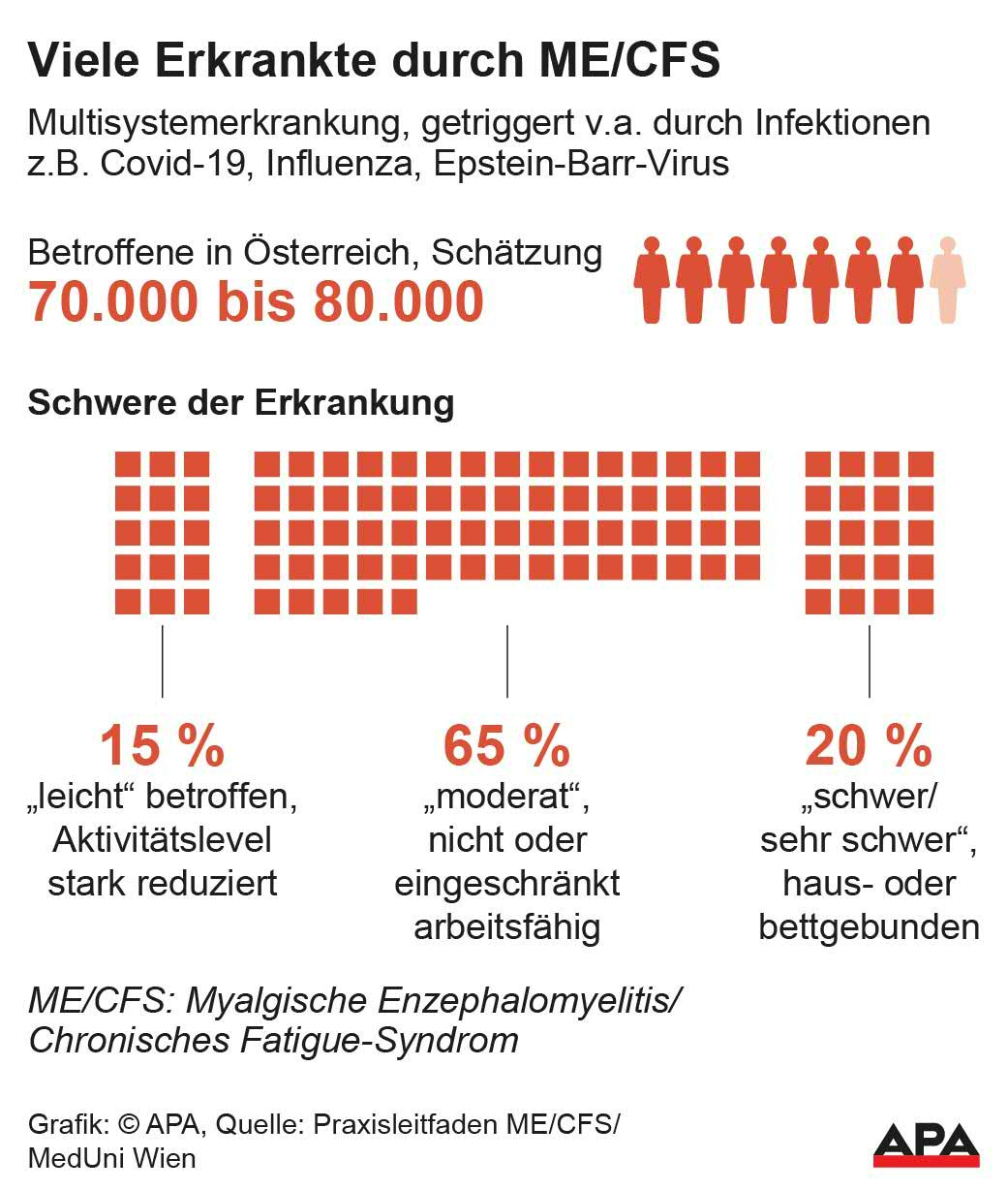 Von der Krankheit ME/CFS sind in Österreich laut Schätzungen der MedUni Wien rund 70.000 bis 80.000 Personen betroffen (abgeleitet aus internationalen Daten), ca. 20 Prozent davon sind schwer oder sehr schwer betroffen. Dabei sind freilich nur jene gemeint, die unter die Kategorie ME/CFS fallen (und damit das Kardinalsymptom PEM aufweisen). Andere von Post-Covid- oder PAIS-Betroffene, die nicht die ME/CFS- Kriterien mit PEM erfüllen, fallen nicht in diese Zählung hinein.