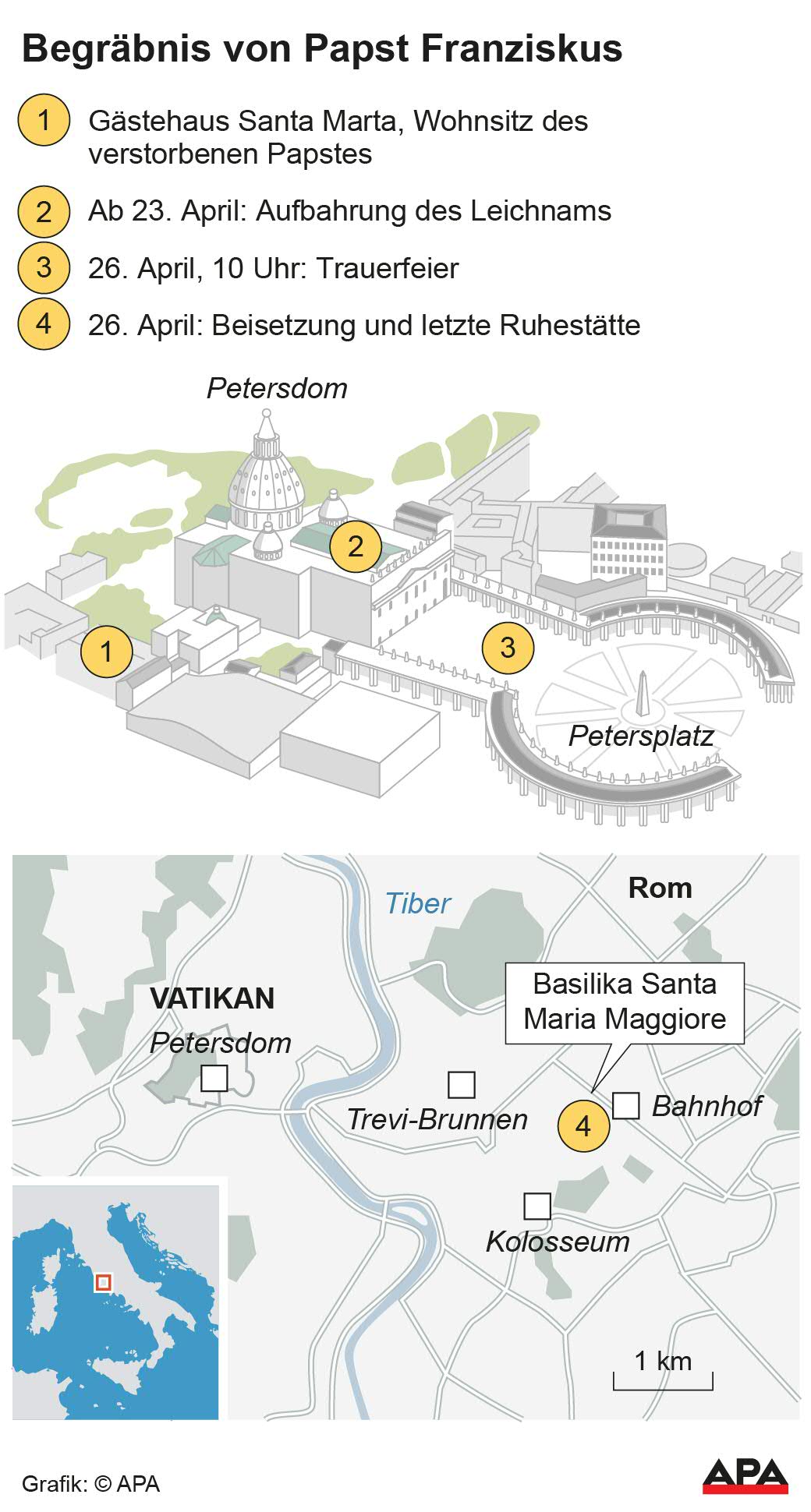Der verstorbene Papst bleibt drei Tage im Petersdom aufgebahrt, damit möglichst viele Gläubige von ihm Abschied nehmen können. Am kommenden Freitag um 20.00 Uhr wird Camerlengo Kardinal Kevin Farrell im Petersdom dem Ritus der Schließung des Sarges von Papst Franziskus vorstehen. Am Samstag ist die Trauerzeremonie auf dem Petersplatz geplant. Dazu werden Staatsgäste aus aller Welt erwartet, darunter Bundespräsident Alexander Van der Bellen und ÖVP-Bundeskanzler Christian Stocker. Unweit des Vatikans werden Großbildschirme aufgestellt. Dort sollen bis zu 100.000 Menschen die Trauerzeremonie verfolgen können.
