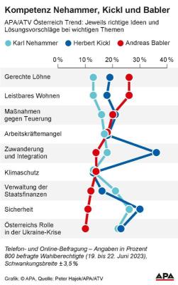 Die Nase vorn hat Kickl in der Umfrage (800 Personen, Zielgruppe wahlberechtigte Österreicherinnen und Österreicher, telefonisch und online befragt von 19. bis 22. Juni, maximale Schwankungsbreite +/- 3,5 Prozent) etwa beim Item "Management von Zuwanderung und Integration" (36 Prozent, damit klar vor Nehammer mit 18 und Babler mit 14). Auch das Thema "für Sicherheit im Land sorgen" (Kickl: 30, Nehammer: 26, Babler: 11) kann er für sich entscheiden, aber auch "Österreichs Rolle in der Ukraine-Krise" (Kickl: 23, Nehammer: 22, Babler: 10) und "Maßnahmen gegen die Teuerung" (Kickl: 21, Nehammer: 16, Babler: 20).