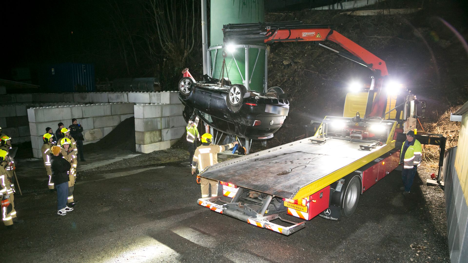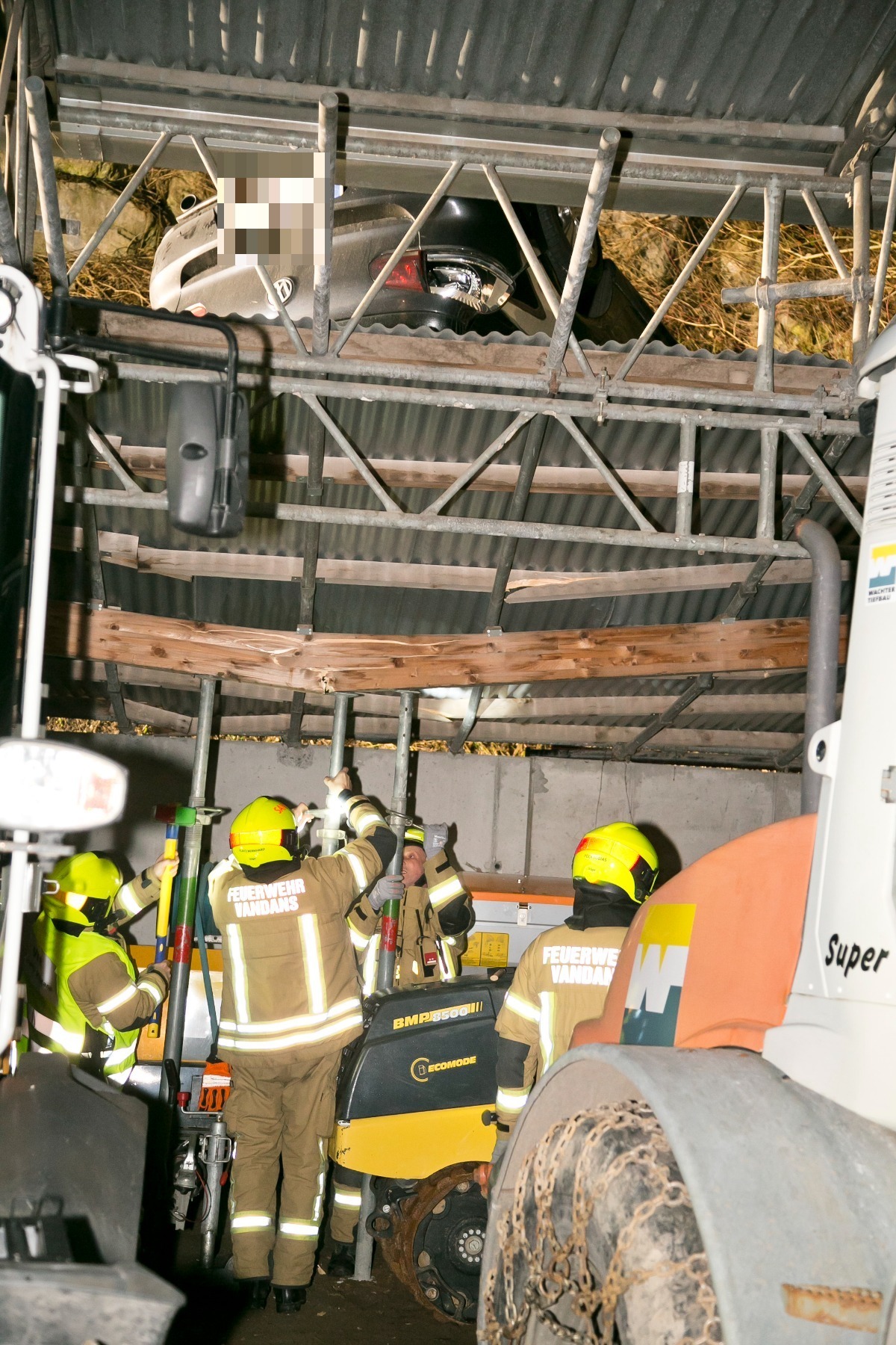 Die zwischenzeitlich verständigte Feuerwehr Vandans führte Sicherungsmaßnahmen am Firmendach durch, sodass der verunfallte Pkw mit einem Hebekran durch ein Abschleppunternehmen geborgen werden konnte.