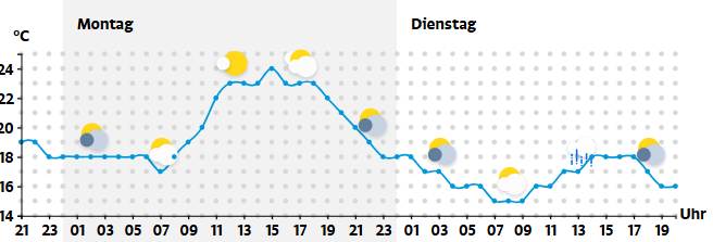 Am Nachmittag bilden sich Quellwolken, am Abend sind vereinzelt lokale Regenschauer möglich. Die Temperaturen steigen auf angenehme 21 bis 25 Grad, in 2.000 Metern Höhe werden rund 13 Grad erreicht. Es weht mäßiger Wind aus West bis Süd.