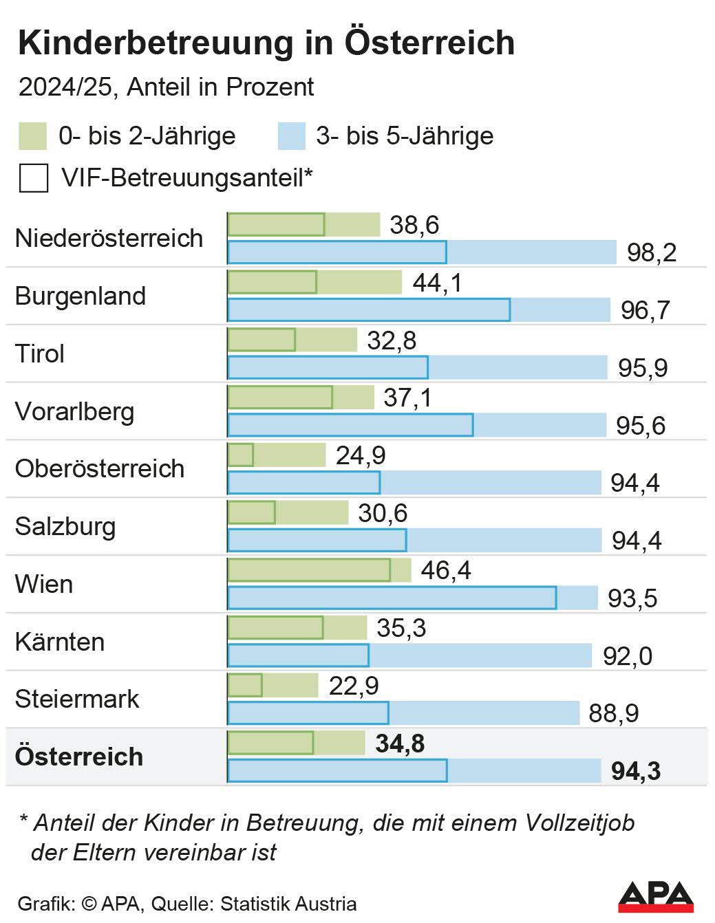 From the age of three, the proportion increases significantly to 89.1 percent. For four-year-olds, it is 95.9 percent, and for five-year-olds, for whom kindergarten is mostly compulsory, it is even 97.9 percent. The comparison with the previous year shows only slight changes here. Recently, 200,800 children (60 percent) attended a facility that allows full-time employment of parents, an increase of 0.9 percentage points. In these so-called VIF-compliant places (offering at least 45 hours per week, at least 9.5 hours on four days, open at least 47 weeks per year), there are still significant differences between the federal states, explained Regina Fuchs, head of the Population Directorate at Statistics Austria. Vienna is clearly ahead with 89.1 percent, while Upper Austria has the lowest rate at 38.5 percent. "Burgenland and Lower Austria have caught up significantly," said Fuchs.