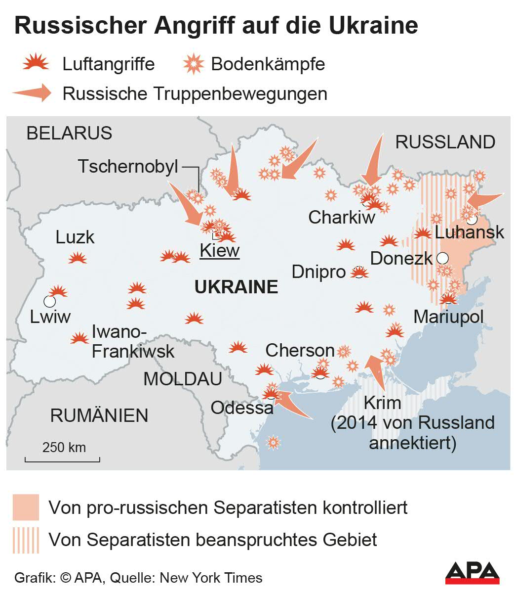 Russland hatte Donnerstag früh mit einem großen Angriff auf die Ukraine begonnen. In mehreren Städten schlugen Raketen und Artilleriegranaten ein. Russische Bodentruppen waren anschließend binnen weniger Stunden bis an den Stadtrand von Kiew vorgedrungen.