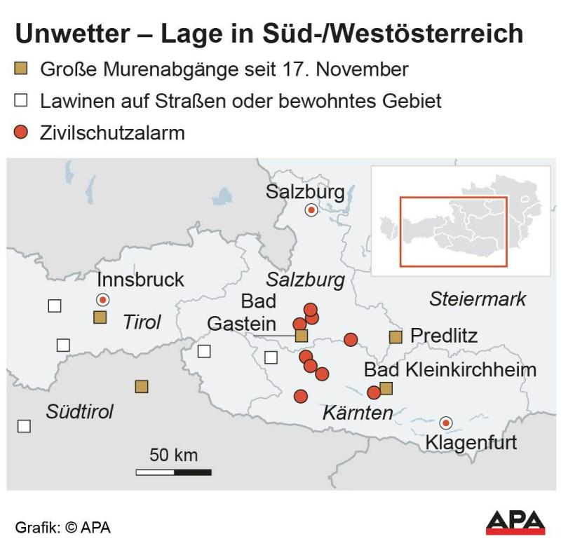 Im Kärntner Bezirk Spittal/Drau blieb in einigen Gemeinden der Zivilschutzalarm aufrecht. Die Mölltal-Bundesstraße B106 bleibt noch tagelang gesperrt, teils bleiben auch die Schulen geschlossen. Zahlreiche weitere Straßen waren ebenfalls unpassierbar, auch die Tauernautobahn A10 war am Montag zwischen Spittal/Drau und Villach in Fahrtrichtung Süden gesperrt. Auch die Tauernbahn fuhr nicht, das wird laut ÖBB auch noch einige Tage so bleiben. Teilweise herrschte Lawinenwarnstufe fünf.