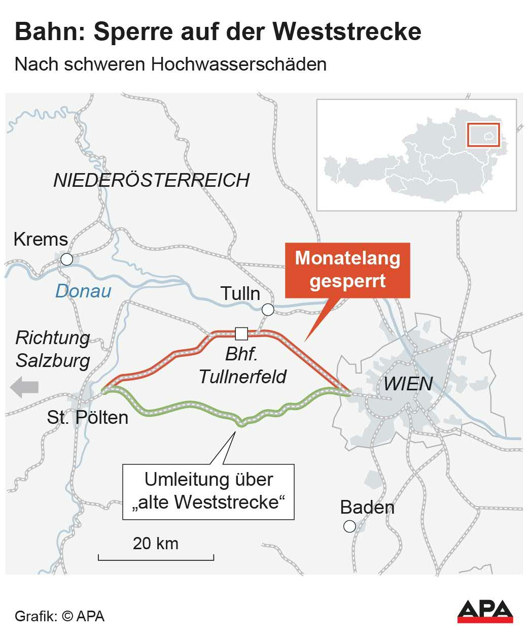 Im 2,5 Kilometer langen Tunnel Atzenbrugg ist laut Engel davon auszugehen, dass die elektrischen Anlagen komplett neu installiert werden müssen. Es gebe dort ebenso wie im Bahnhof Tullnerfeld nach wie vor keine Stromversorgung. Im Lainzer Tunnel, der Verbindung von Wien-Meidling zur Weststrecke, und beim Knoten Hadersdorf hat es der Vorständin zufolge durch das Hochwasser auf dem Wienfluss ebenfalls Wassereintritte und Überflutungen gegeben. Die Folge seien auch hier Schäden an der Elektroinstallation und an Weichenantrieben sowie kaputte Gleisteile.