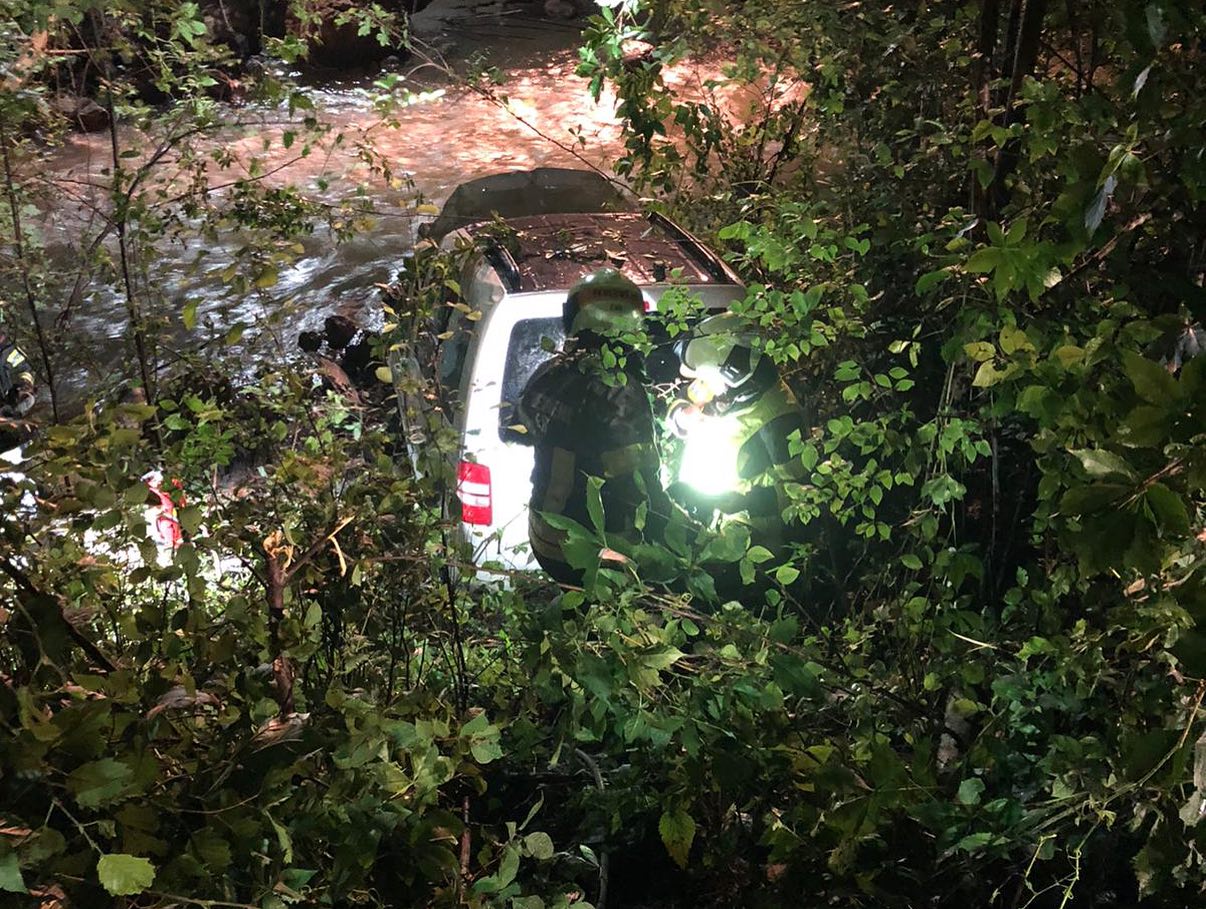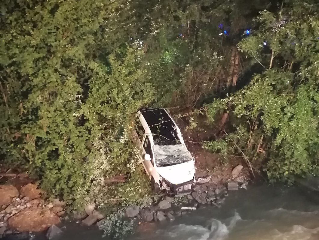 Das Auto kam von der Straße ab und landete im Bachbett.