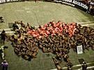 Fast nackt, nur mit brauner, schwarzer und roter Farbe bemalt legten sich über 100 Mitglieder und Unterstützer der Tierrechtsorganisationen PETA (People for the Ethical Treatment of Animals) und AnimaNaturalis zwei Tage vor der Stierhatz in Pamplona auf die Straße.