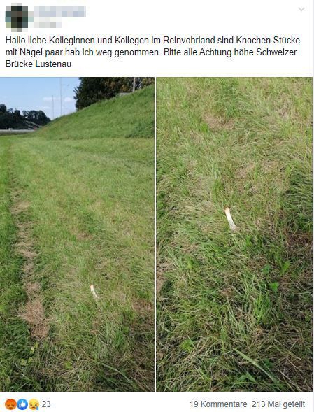 Auf Facebook warnt ein User vor mit Nägeln versehenen Knochen im Rheinvorland auf Höhe der Schweizer Brücke.
