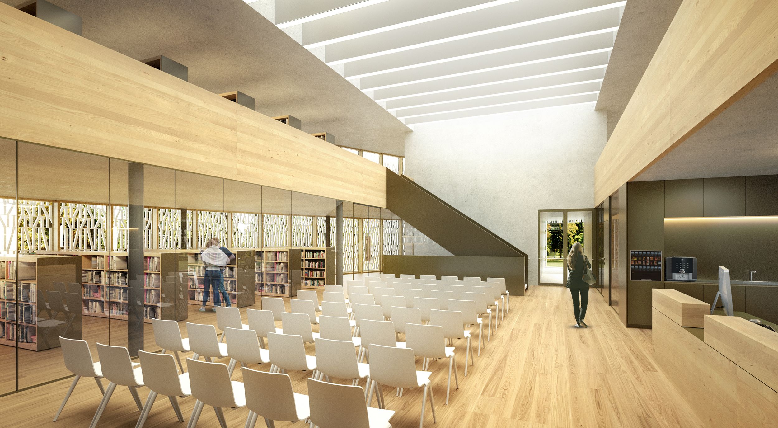 Das Herzstück der neuen Stadtbibliothek bildet ein zweistöckiger, von oben belichteter Raum, der einem großzügigen Foyer, der zentralen Ausleihe und einer Lounge Platz bieten wird. Die Kinderbücherei mit einem Freihand-Regalbereich, einem Kreativraum und einer Bücherhöhle ist ebenfalls von diesem Zentralraum aus zu begehen.