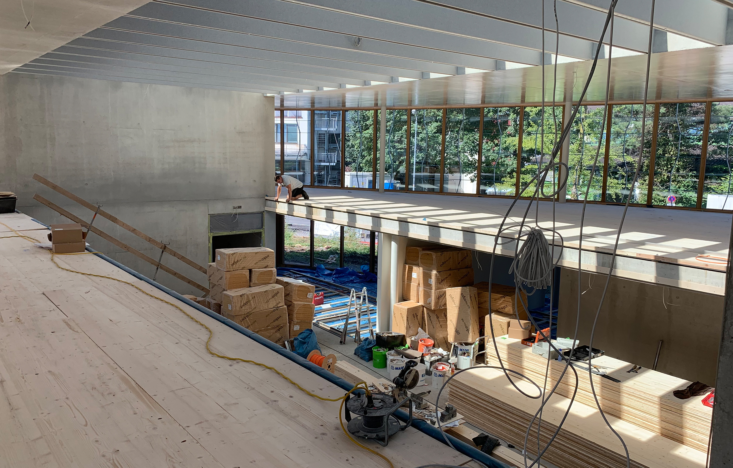 Im Inneren des neuen Gebäudes erfolgt bereits der Aufbau der Fußböden nachdem die Installationen großteils fertiggestellt sind. Anschließend werden die Tischlerarbeiten folgen.