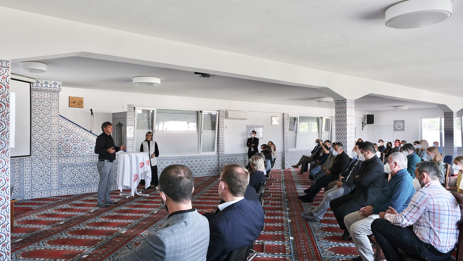 Im islamischen Glauben beten Frauen und Männer getrennt. Im bisherigen Gebetsraum in der bestehenden Moschee haben wir zwei separate Räume, die nicht verbunden sind. Es gibt keine direkte akustische und visuelle Verbindung - das Gebet und andere Veranstaltungen werden über eine Medienanlage übertragen. Im Neubau können nun endlich Frauen und Männer gemeinsam in einem großen Raum an dem Gebet teilhaben und gleichzeitig den Glaubensregeln entsprechen.