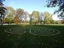 Der Gesamtdurchmesser des Labyrinths beträgt 18m. Als Begrenzung wurde Flussbeetschotter auf einer Breite von 40 cm und einer Länge von 217m hochkant händisch verlegt. Dazwischen wurde Rasen angebaut. Die automatische Bewässerungsanlage wurde angepasst bzw. erweitert. Die landschaftliche Umgestaltung neben dem Steinlabyrinth: eine schüsselartige Böschung, auf der in den nächsten Jahren ein Baumkreis gepflanzt wird.