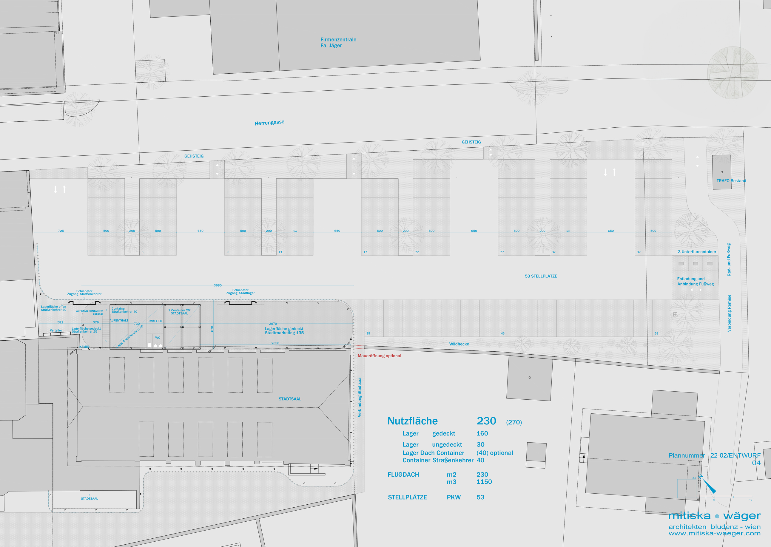 „Wir brauchen ein zentrumsnahes Lager für die unzähligen Veranstaltungen in der Stadt und für unsere Straßenreinigung. Zudem nützen wir die Gelegenheit für eine Neugestaltung des Parkplatzes in der Herrengasse“, kündigt Bürgermeister Simon Tschann an. Vor allem auf eine stadttaugliche Bepflanzung wurde im Außenbereich geachtet und auch die Oberflächengestaltung wird „nachhaltiger“. „Wir versuchen mit deutlich weniger versiegelten Flächen durchzukommen. Das ist gerade im Stadtzentrum sehr wichtig“, schildert Tschann.