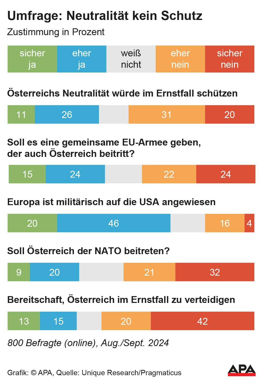 Auf die Frage "Würde Österreichs Neutralität im Ernstfall vor einem Angriff schützen?", antworteten 51 Prozent der Befragten, die Neutralität bedeute auf keinen Fall oder eher keinen Schutz. Zwei Drittel sagen: "Europa ist militärisch auf die USA angewiesen und kann sich nicht aus eigener Kraft verteidigen."