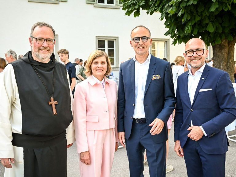 18.06.2025 Am vergangenen Freitagabend lud das Kloster Mehrerau zur Eröffnung der diesjährigen Sommerausstellung unter dem Titel „Hoi b’sundrig!“. Rund 150 Gäste folgten der Einladung und erlebten bei sommerlich-heißen Temperaturen eine atmosphärische Vernissage im schattigen Klosterhof.