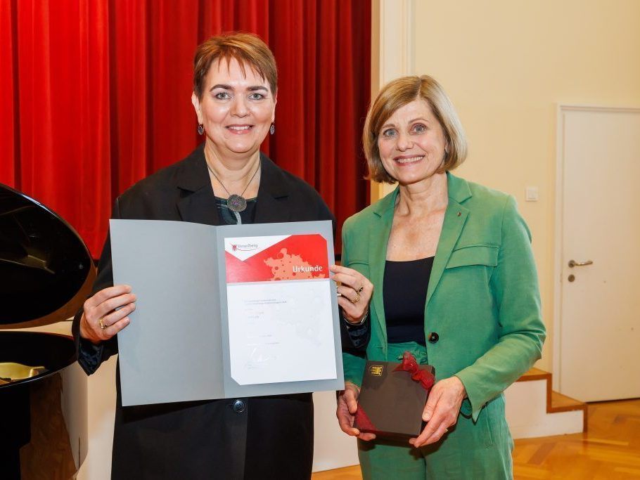 8.10.2024 Landesstatthalterin Barbara Schöbi-Fink überreichte die Auszeichnung der in Röthis lebenden Komponistin.