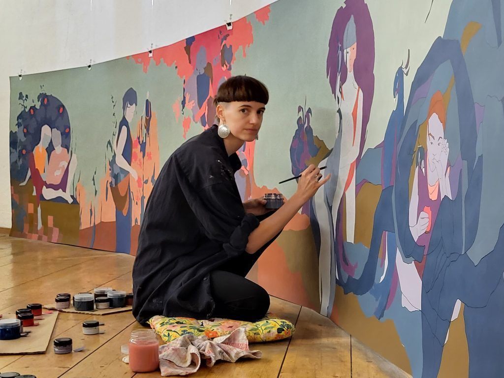 22.08.2024 Aktuell arbeitet die Künstlerin Omani Frei im Pulverturm in Feldkirch an ihrem Werk „Pfau“. Heute Nachmittag lässt sie Interessierte beim „Offenen Atelier“ am Malprozess teilhaben.