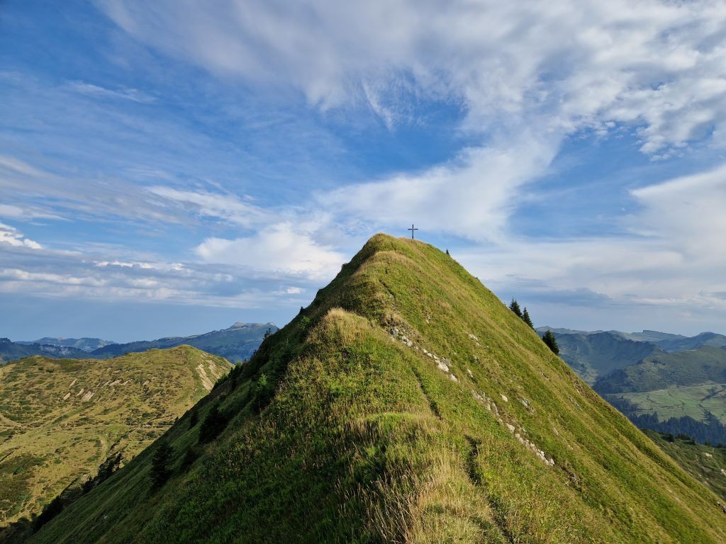 1.09.2023 Wanderführer Hertha Glück und Gerhard Vylet steigen über Wald- und Wiesenwege zur Kreuzspitze auf, genießen den Rundumblick und am Rückweg eine Jause.