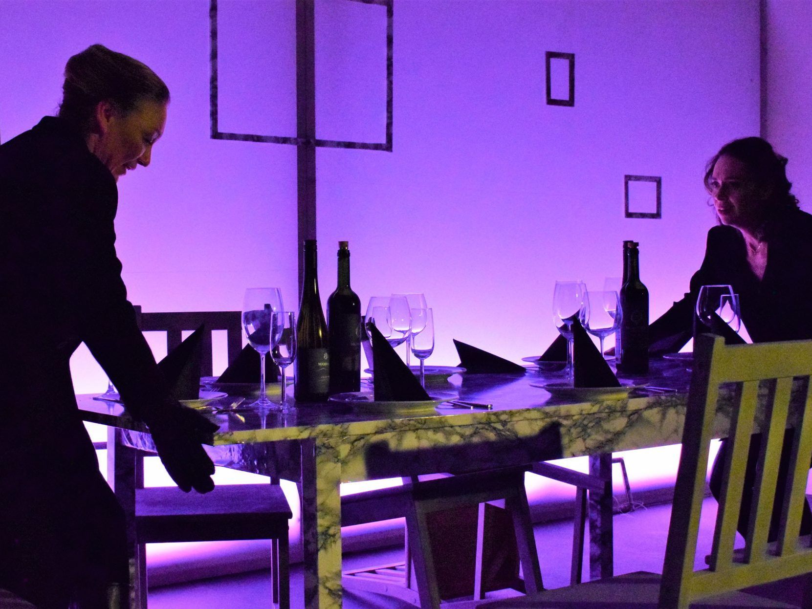 27.01.2023 Gestern war im Theater Kosmos die Uraufführung der Kosmodrom-Stückentwicklung „Oder ein Schiefer im Stamm“. Zwei Verwandte begegnen sich vor der Beerdigung. Der Tisch ist gedeckt und der Wein steht bereit. Den werden sie auch brauchen, denn anstatt gegenseitiger Anteilnahme und emotionaler Unterstützung bringt der Tod von Valeries Mutter lange in sich getragene Kränkungen hervor, die