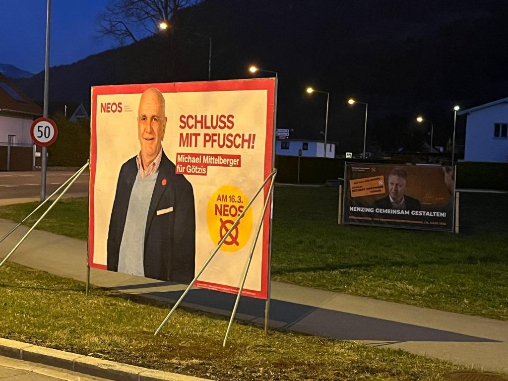 24.03.2025 Wahlplakat aus Götzis sorgt im Nenzinger Wahlkampf zur Bürgermeister-Stichwahl für Verwirrung.