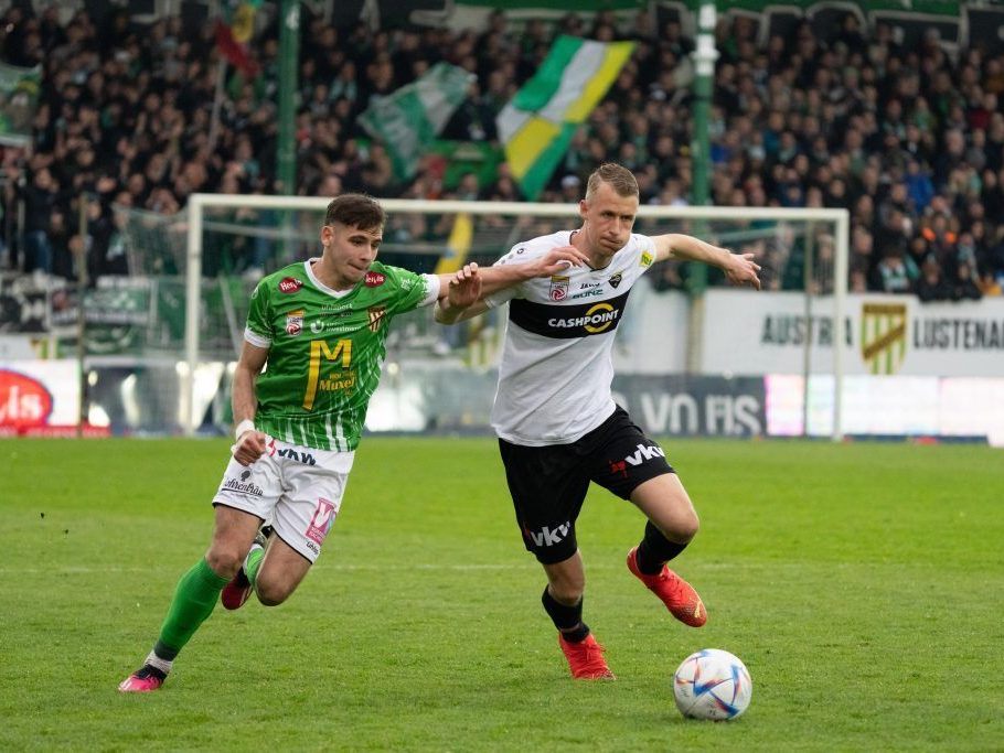 6.04.2023 Austrias Spielmacher Stefano Surdanovic bekommt es im großen Ländlederby mit Altachs Abfangjäger Lukas Jäger zu tun.