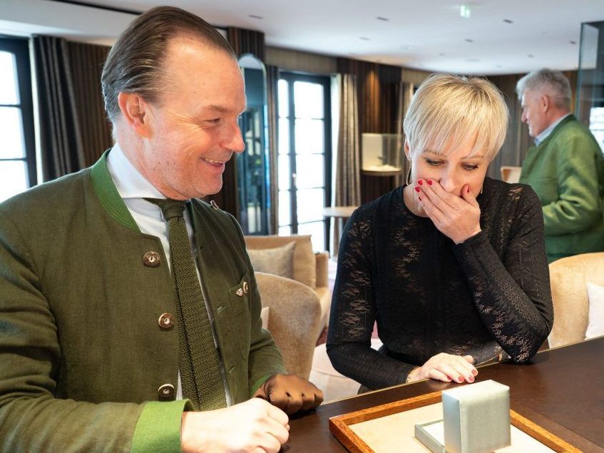 25.03.2025 Die Gewinnerin der Edelsteinpirsch durfte bei Huber Schmuck ihren selbst entworfenen Ring in Empfang nehmen.