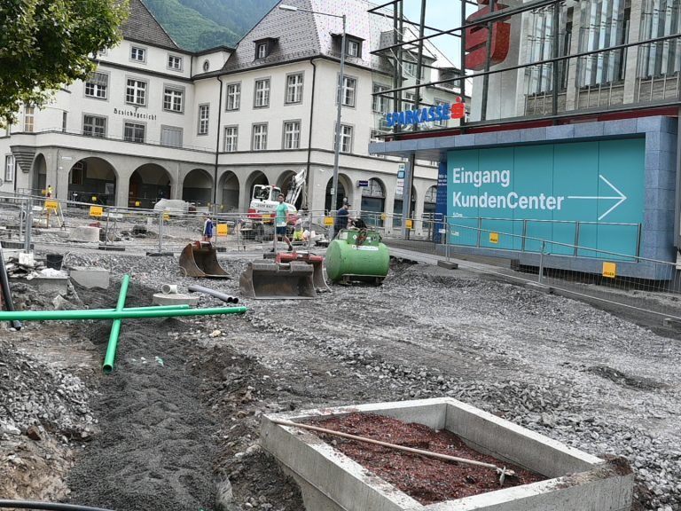 16.08.2024 Bludenz. Noch bis Mitte September sind am Sparkassenplatz und in der Untersteinstraße schwere Baumaschinen im Einsatz.