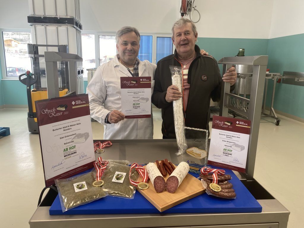 21.04.2023 Alois Walser und Adi Burtscher gewinnen mit ihrer Zirbensalami bei einem österreichischen Wettbewerb. Die Zirbensalami ist aber nicht ihr einziges Produkt, das ausgezeichnet wurde.