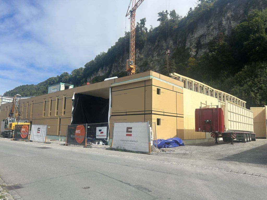 17.09.2025 Der Neubau des ASZ in Gisingen schreitet weiter voran. Die Montage der Holzkonstruktion läuft.