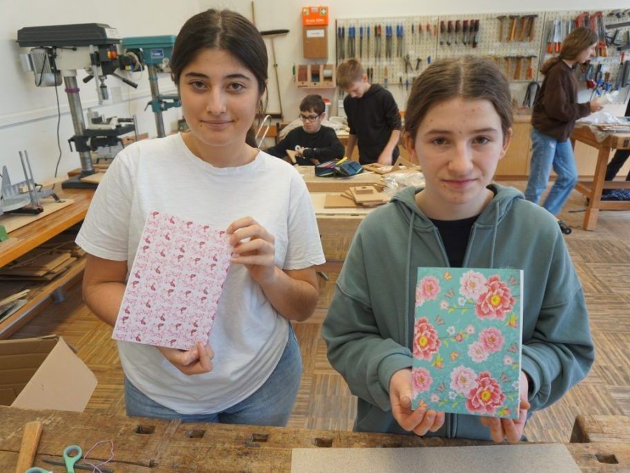 5.06.2023 Die Mittelschule Klostertal zeigt auf der VN-Kinder- und Jugendbuchmesse Buch am Bach, wie Notizheftchen gebunden werden.