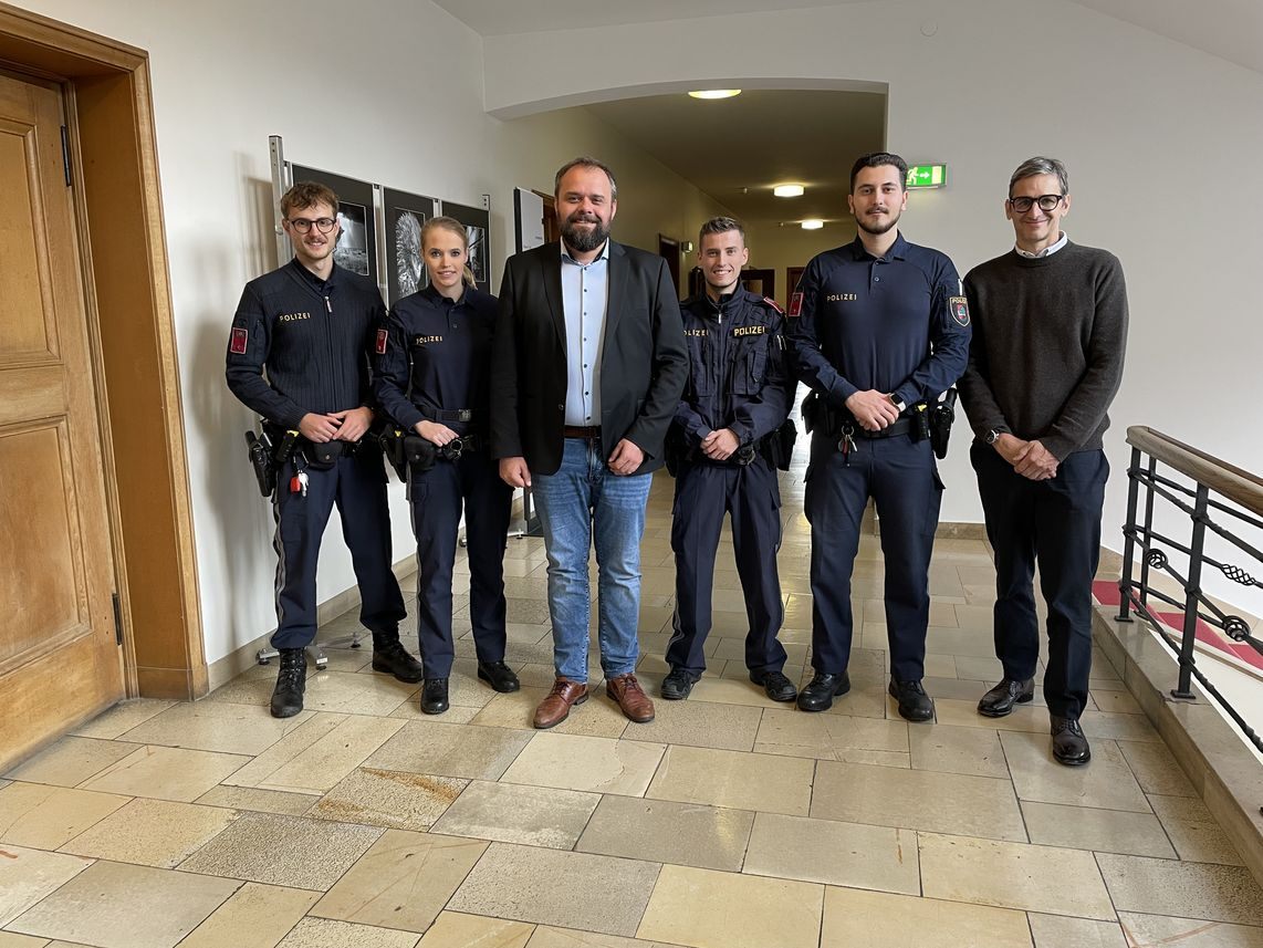 20.11.2025 Vier Polizeischülerinnen und Polizeischüler haben ihre Ausbildung erfolgreich abgeschlossen und wurden heute von Bürgermeister Markus Fäßler offiziell in den Dienst der Stadtpolizei Dornbirn gestellt.